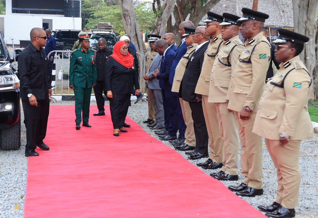 President of the United Republic of Tanzania and Commander-in-Chief Hon. Samia Suluhu Hassan greeting the Police Force Leaders immediately after arriving at the Police Officer's Mess Oyster bay in Dar es Salaam.